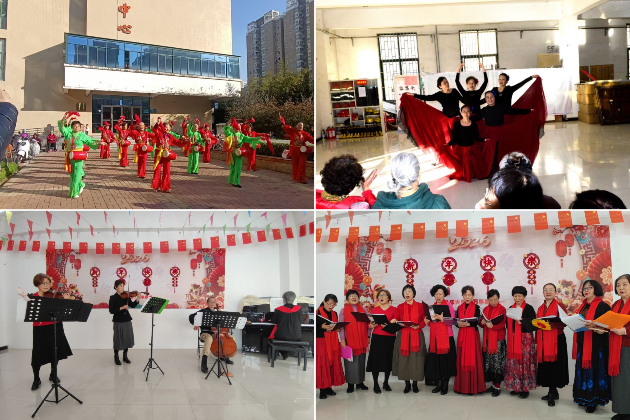 12 月 26 日,老校区的迎新年活动接连上演。下午,老校区合唱团带来诚意满满的表演:女声朗诵《新年颂》声情并茂,道出对新年的美好憧憬;合唱《太阳最红毛主席最亲》饱含深情,传递对伟大领袖的崇敬与怀念;《珊瑚颂》《我们是快乐的好朋友》等曲目节奏明快、感染力强,老同志们载歌载舞共享欢乐。