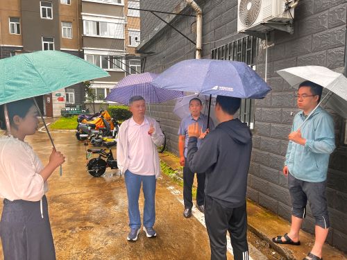 9 月 11 日上午,大雨持续倾泻,学府欣园小区离退休老同志此前集中反映的“活动室门前道路积水”问题更显突出 —— 雨水在路面形成明显积水带,部分区域水深没过脚踝,不仅影响通行,更存在滑倒风险。针对这一急难诉求,处领导田军强、赵玮玮、文体活动科长王景政,联动校办产业管理中心及物业服务部相关负责人组建排查组。一行人冒着滂沱大雨赶赴现场。大家实地测量水深、标记积水覆盖范围,仔细检查排水系统运行情况,全面掌握隐患细节,确保确保全面掌握雨天积水的真实情况。